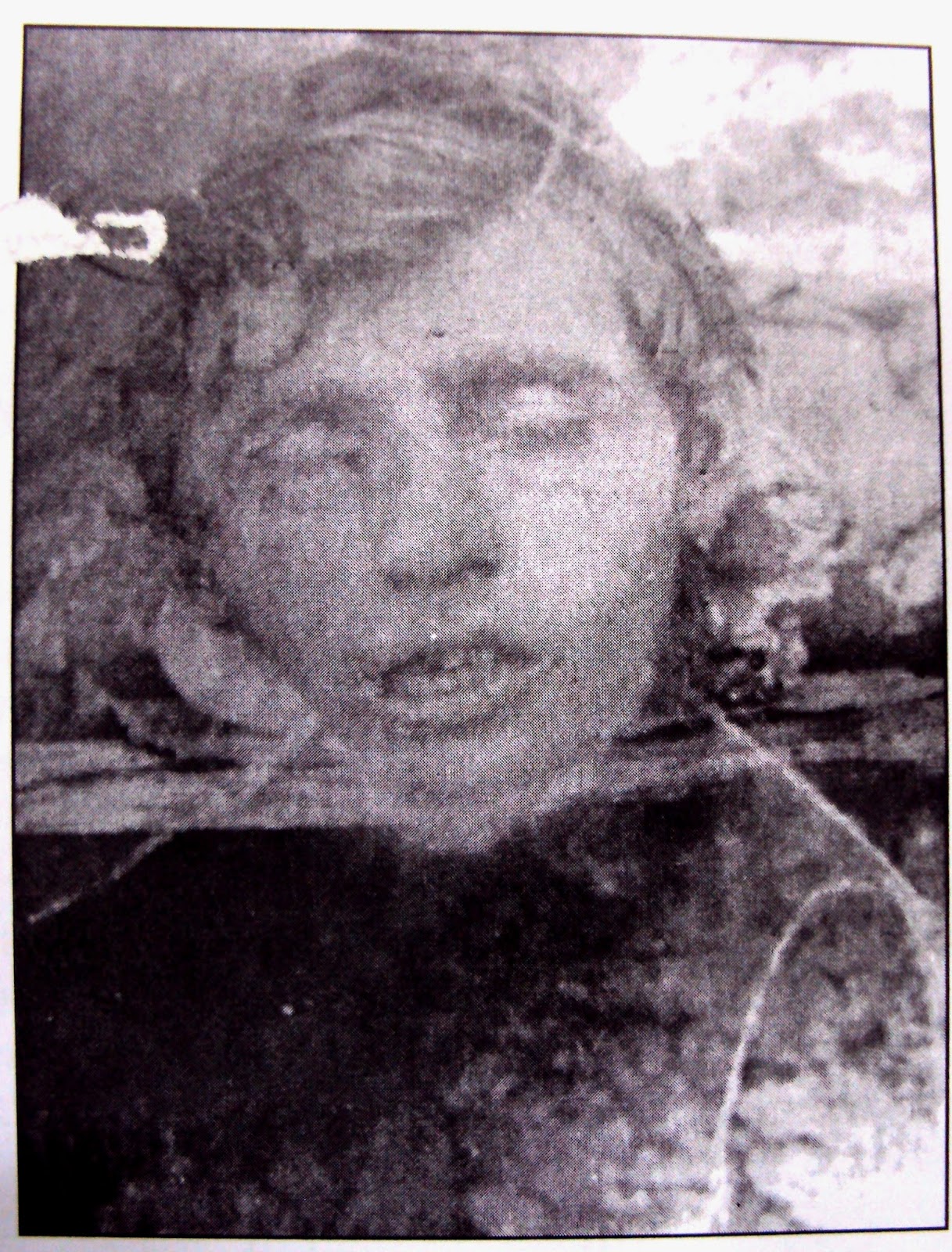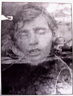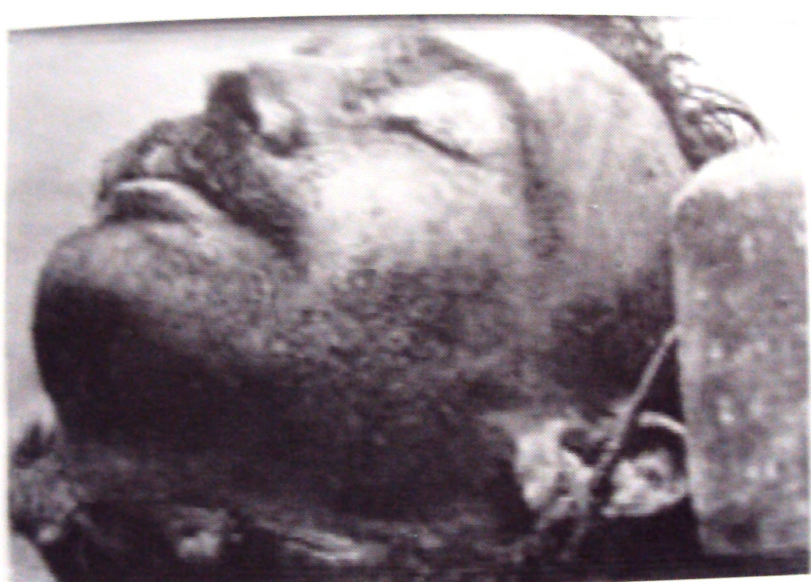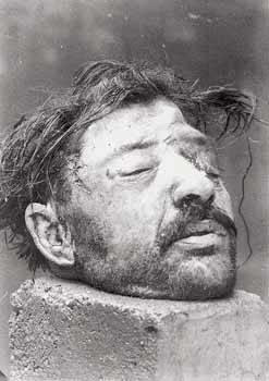 89) Το κεφάλι του αγνώστου εκδιωχθέντα αγωνιστή του ΕΛΑΣ φωτογραφίζεται στην Χαλκιδική το 1945. Στην φωτογραφία φαίνονται τα σύρματα στα αυτιά του που έχουν περαστεί για να κρεμαστεί το κεφάλι από φανοστάτη ή δέντρο. (Αρχείο Φαρσακίδης)