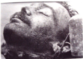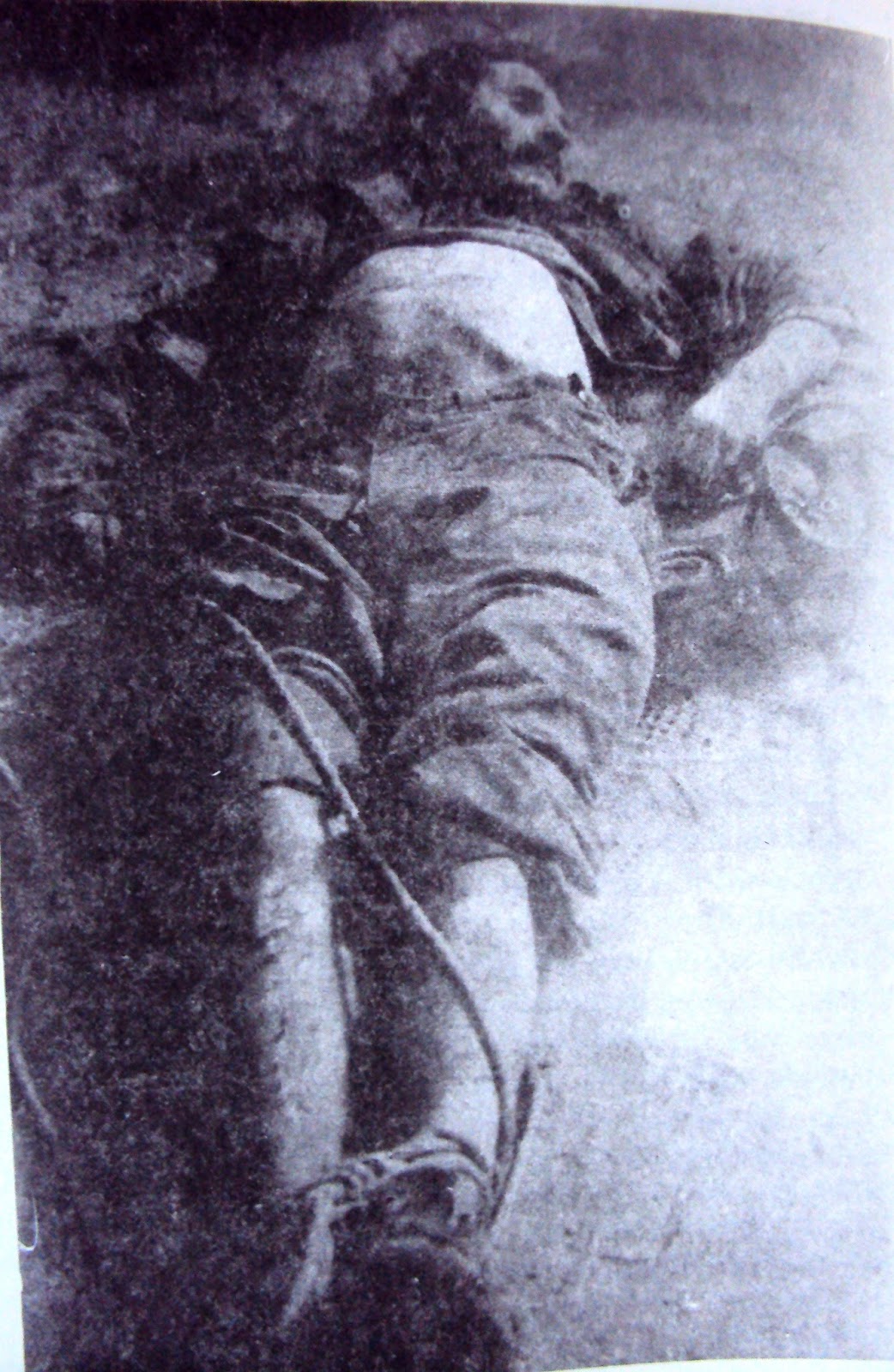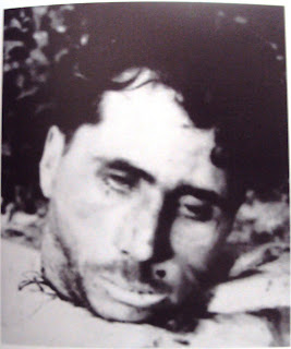 120) Παρακάτω βλέπουμε το άψυχο κορμί του Γεώργιου Κοδελά (Καπετάν Γιώργης) από την Κορινθία Πελοποννήσου. Ο Γιώργος Κοδελάς μετά την Απελευθέρωση εγκαταστάθηκε στα Χανιά και υπήρξε από τα ικανότερα στελέχη του ΔΣΕ Κρήτης.