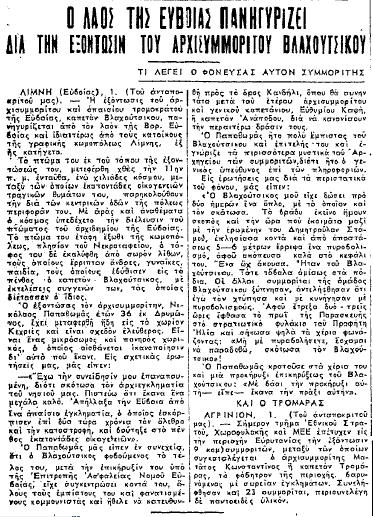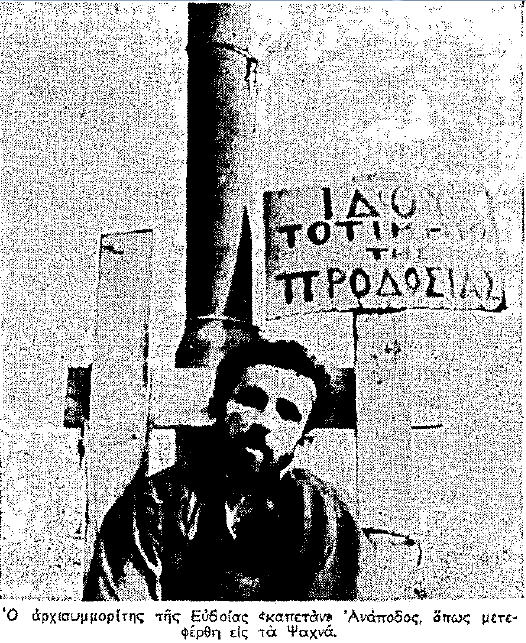 22) Στην Λίμνη Ευβοίας, το άψυχο σώμα του δολοφονημένου με προδοσία Γεώργιου Βλαχούτσικου (Ευβοιώτης) εκτέθηκε σε κοινή θέα τον Σεπτέμβρη του 1949 απέναντι από τα γραφεία της Χωροφυλακής.