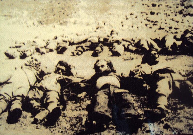 15) Το νεκρό σώμα του Ευάγγελου Γκόγκλη του ΔΣΕ και 3 συντρόφων του εκτίθενται σε κοινή θέα στην Έδεσσα το 1949 16) Το νεκρό σώμα του Γιώργου Ατζακλή, ταγματάρχη του ΔΣΠ και 7 ανταρτών του βρίσκεται σε κοινή θέα στους Μολάους το 1948. Οι Χίτες τους εξέθεσαν με μακάβριο τρόπο. Οι σύντροφοι του Ατζακλή και των οποίων τα κεφάλια εικονίζονται εδώ είναι οι: Δημήτρης Αλεβίζος, Γιάννης Δημουράς, Νίκος Κοτρωνάκης, Γιάννης Λασσογιάννης, Γιώργης Λυμπέρης, Βασίλης Μανδηλάρης και Δημήτρης Φιλάκος.