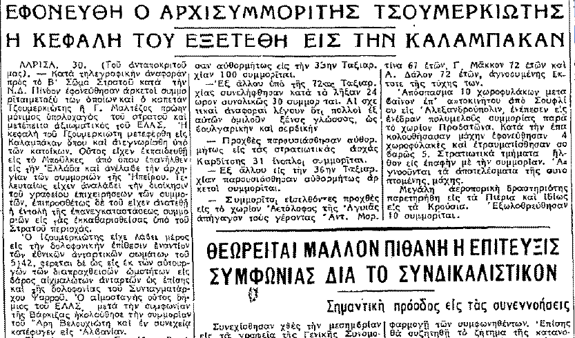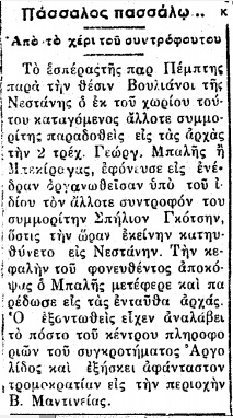 117) Το κεφάλι του Σπήλιου Γκότση, αντάρτη του ΔΣΕ που κρύβονταν στη θέση Βουλιάνοι κοντά στο χωριό Νεστάνη, αποκόπηκε από τον κατά τις εφημερίδες πρώην αντάρτη Γεώργιο Μπαλή ή Μπεκίραγα και μεταφέρθηκε στις αρχές. Ο χώρος έκθεσης της κεφαλής μένει άγνωστος.
