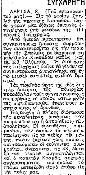 112) Μιχάλης Κυρίτσης, ελεύθερος σκοπευτής του ΔΣΕ. Παγίδεύτηκε κατά τη διάρκεια της εισόδου του στη Λάρισα και σκοτώθηκε μερικές ημέρες μετά από στρατιώτες του Εθνικού Στρατού. Το πτώμα του καρφώθηκε σε παλιά πόρτα και εξετέθη στον Προφήτη Ηλία.