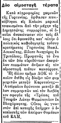 31) Τα κεφάλια των διμοιριτών Φάνη Κερπίνη και Λάκη Παντίδα του ΔΣΕ Ευβοίας κόπηκαν από χίτες και κρεμάστηκαν σε φανοστάτη της Χαλκίδας.