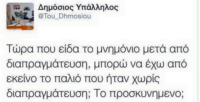 Σε αυτό έγραφε παραθέτοντας και το απόκομμα του εισιτηρίου: «To εισιτήριο εισόδου μου του 1971 στην Ακρόπολη αναγράφει ένα σχόλιο του Πλουτάρχου για τον Περικλή: Υπηρέτησε την πόλη, όχι τον εαυτό του».